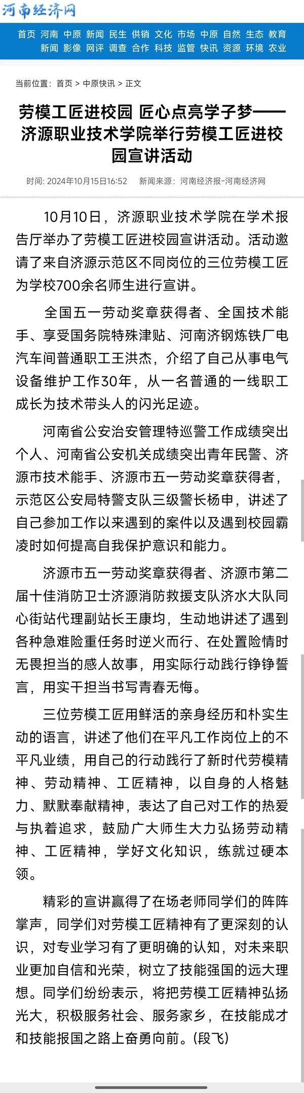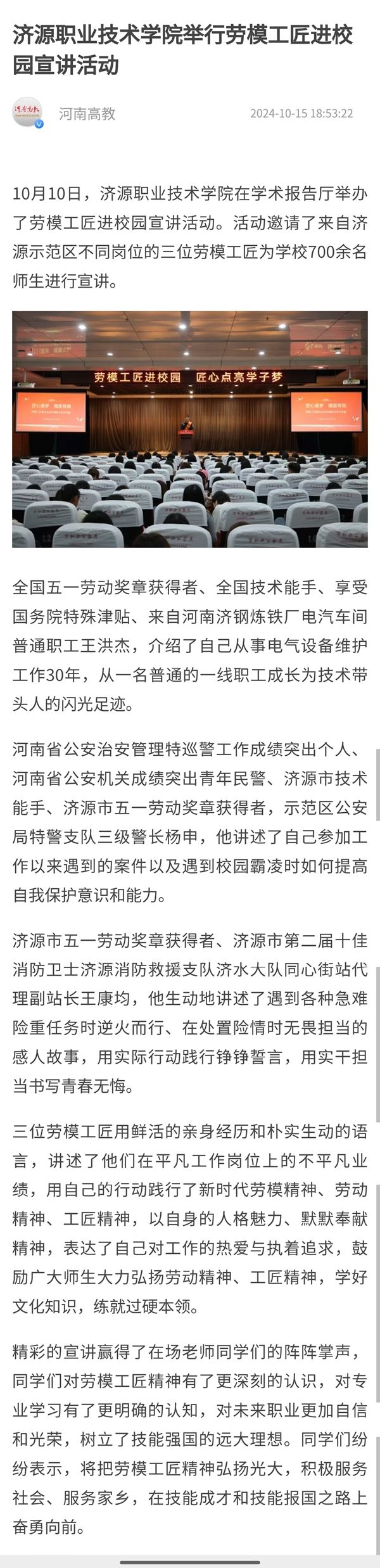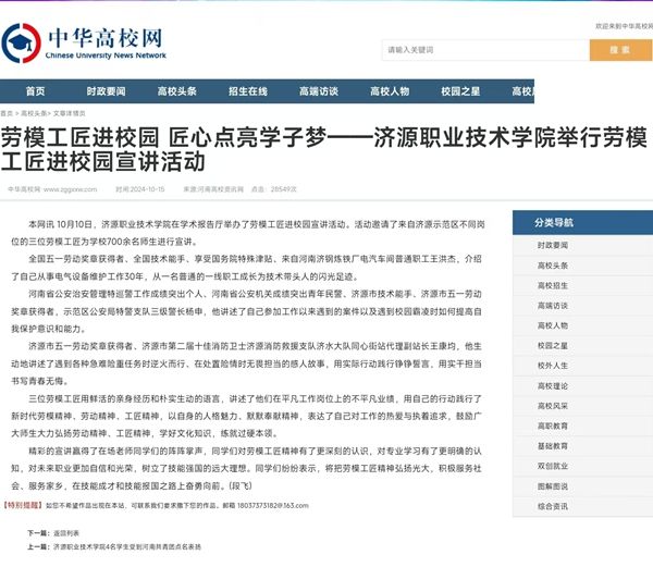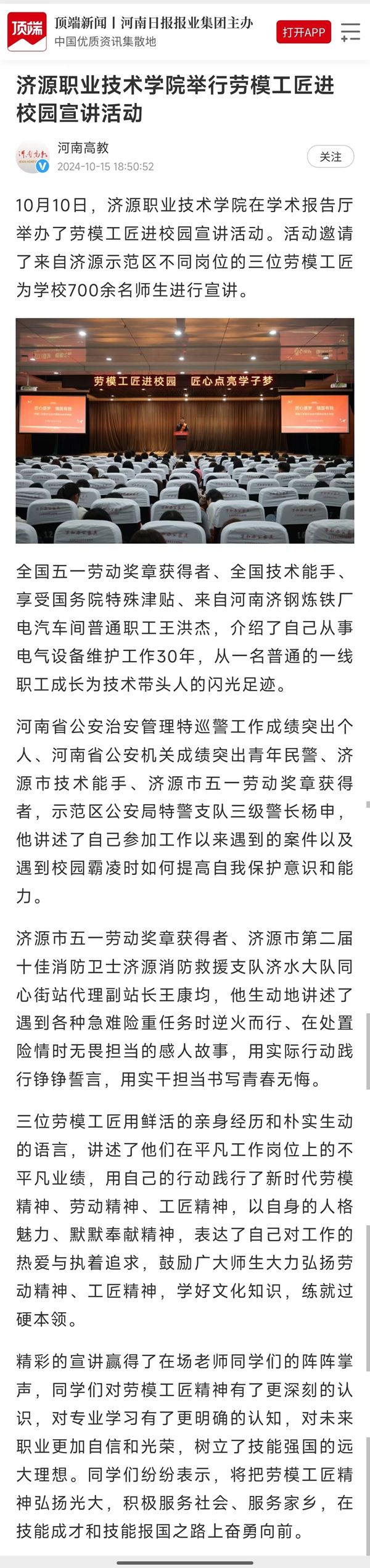 转自2024年10月15日顶端新闻 、大象新闻、 河南教育宣传网、河南高校资讯网、中华高校网、中新网、中原经济网、新豫网、河南高校行:劳模工匠进校园 匠心点亮学子梦——济源职业技术学院举行劳模工匠进校园宣讲活动