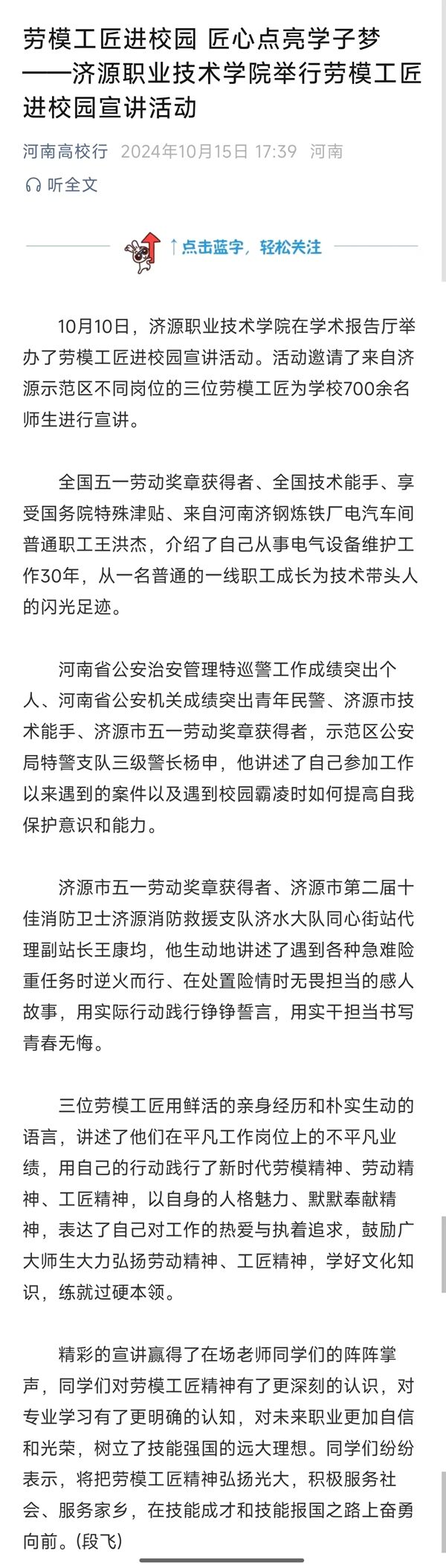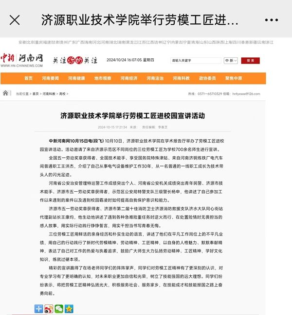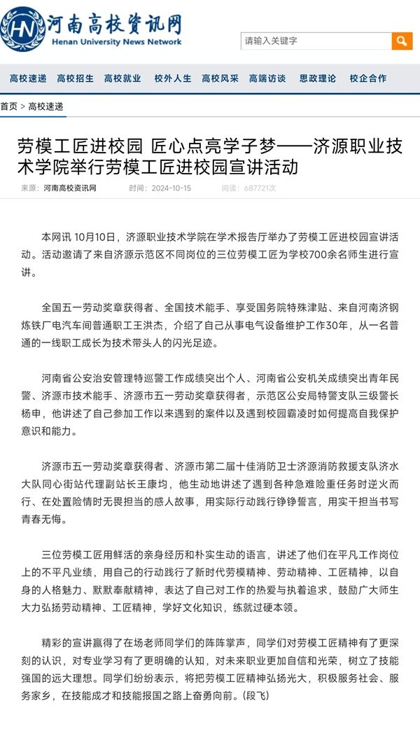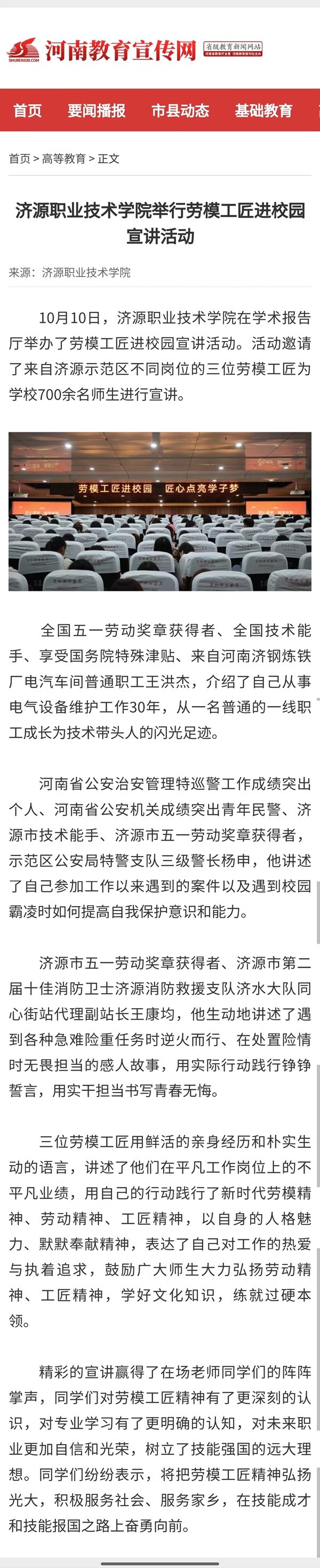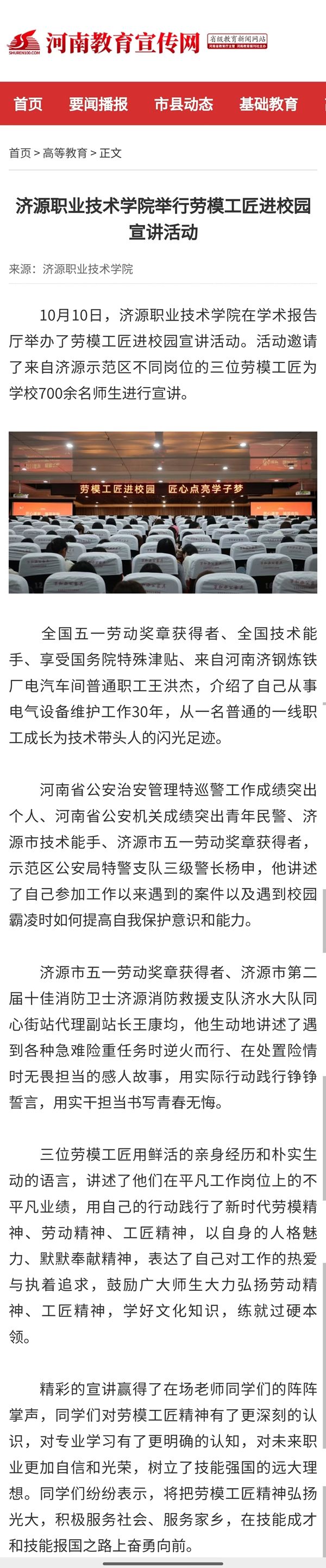 转自2024年10月15日顶端新闻 、大象新闻、 河南教育宣传网、河南高校资讯网、中华高校网、中新网、中原经济网、新豫网、河南高校行:劳模工匠进校园 匠心点亮学子梦——济源职业技术学院举行劳模工匠进校园宣讲活动